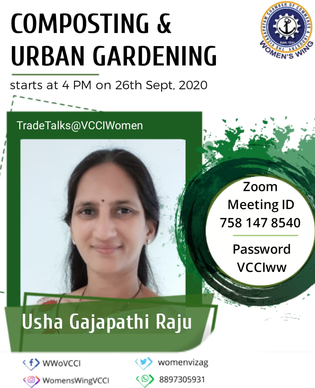 A webinar on ‘COMPOSITION & URBAN GARDENING’. The speaker Ms Usha Gajapathiraju is a Women’s Wing VCCI member and a dietician by profession and Treasurer of the Diabetic Child Society. She stated that there is nothing that can beat home grown food in terms of freshness and taste. And also quoted that she wants to inspire people to take up urban gardening and help them understand that “we are what we eat” and to motivate them to “grow what they eat”.