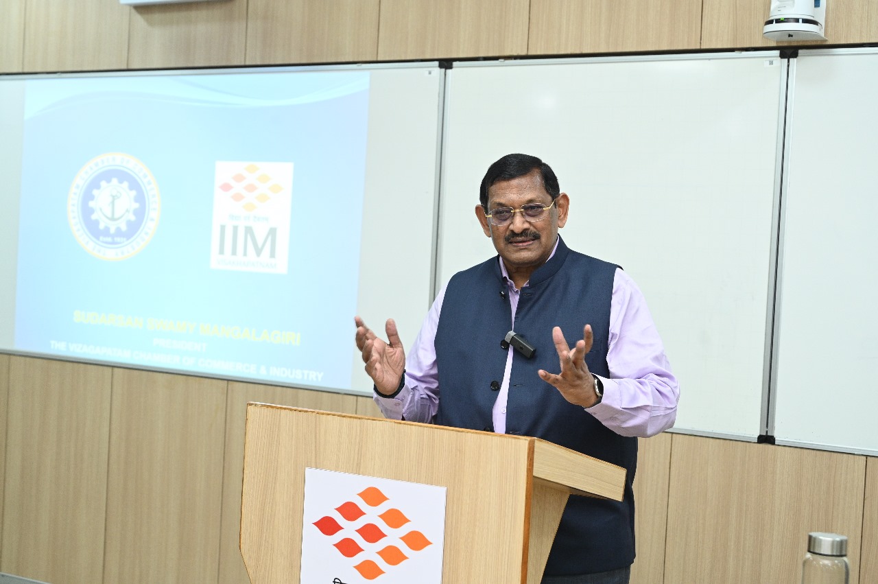 Mr. Sudarsan Swamy, President of VCCI, was invited as a distinguished speaker by the Indian Institute of Management Visakhapatnam (IIMV) for the prestigious “Founders Talk”, held on 1st March 2025. During the event, Mr. Swamy shared his personal journey as an entrepreneur, highlighting the challenges he faced, the lessons he learned, and the valuable insights he gained along the way.