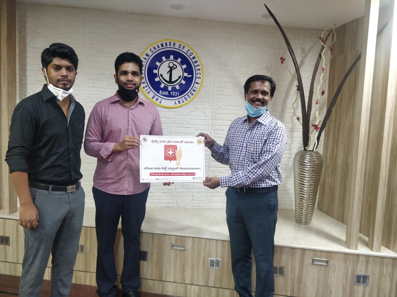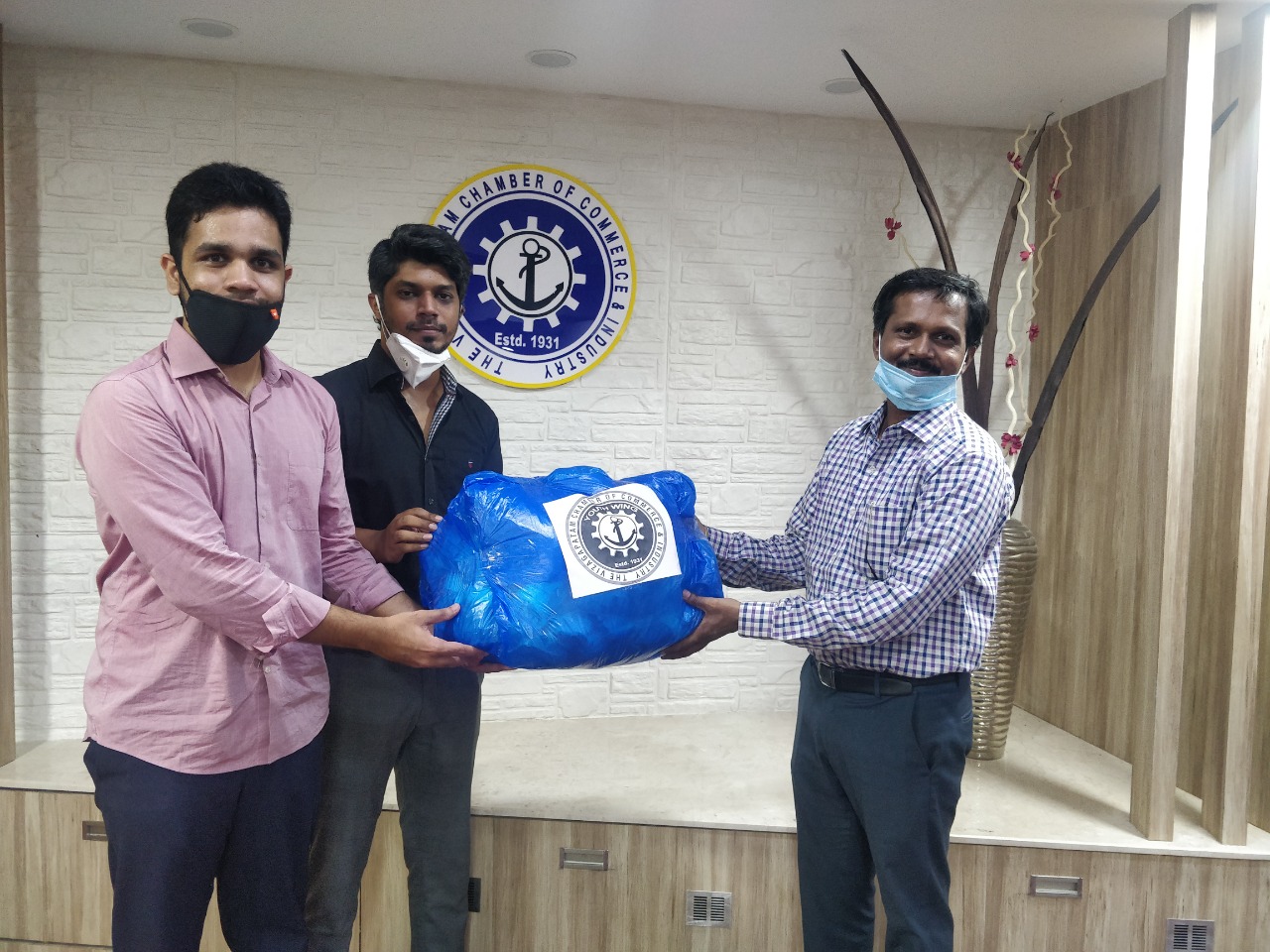 The Youth Wing, VCCI, donated 1000 masks to Vizag Volunteers on 29th August 2020 to help prevent the spread of COVID-19 . The masks were handed over to Mr Satish of Vizag Volunteers. The Youth was represented by the President, Mr C V Anirudh Rao and Committee Member, Mr Shrikanth K. The Youth Wing, functioning under the aegis of the Vizagapatam Chambers of Commerce & Industry, is a professional body to promote the interests of the young entrepreneurs of the city